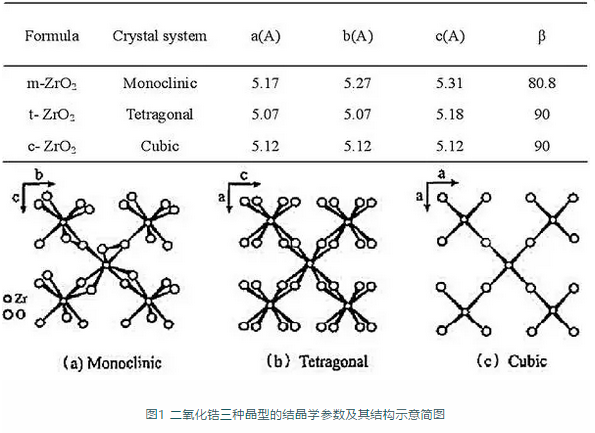 常溫下純二氧化鋯是絕緣體,加入穩定劑可使其導電率升高且在高溫下能呈現出離子型導電。二氧化鋯有三種晶型,結晶學參數及其三種晶型的結構示意簡圖如下所示。