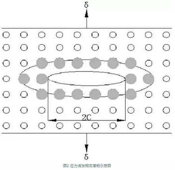在外力δ的作用下長度為2c的裂紋周圍發生t-m相變,灰色顆粒表示已經發生t-m相變的部分,白色代表未發生相變的部分。