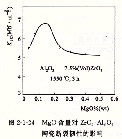 為了進一步改善增韌效果,適當引入其他物質,形成固溶體,例如引入Mg0、Al。()。、【:c()及Hfoz等。當氧化鋯中含有0.12%(mol) Mg0時,ZTA陶瓷的斷裂韌性(KIc)有最大值。如圖2-1-24所示。引入Alz Oa,可以抑制氧化鋯晶粒長大。又如引入Hfoz,由于Hf07具有和氧化鋯類似的結構和特性,而且由于它比氧化鋯具有更高的M,(相轉變溫度)和A,(逆相變終止溫度),同時還具有比氧化鋯低的熱膨脹系數(shù)和相變 t-氧化鋯一m-氧化鋯體積效應。因此Hf02有較高的耐高溫性能和抗熱震性。另一方面,由于Hf02高的姚溫度, t-氧化鋯向m-氧化鋯的相變驅動力大,相變的臨界顆粒尺寸也小,所以在冷卻過程中,很難保存足夠的t-氧化鋯,這對相變增韌是有利的。但當Hf02-氧化鋯固溶體中引入少量Y2 0a和采用特殊工藝手段,可以使Y2 0a -Hf02 -氧化鋯固溶體獲得較高的t-氧化鋯,具有良好的增韌增強效果,同時可以改善ZTA陶瓷的高溫性能。